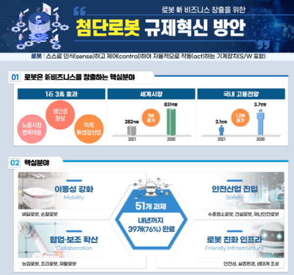 산업부는 올해 3월 제3회 규제혁신전략회의에서 관계 부처 합동으로 '첨단로봇 규제혁신 방안'을 발표했다. 정부는 로봇산업이 생산성 향상, 인력 부족 및 산업재해 예방, 미래 新성장산업 등 1석3조 효과를 가진 핵심분야로 부상하고 있어 첨단로봇으로 산업혁신을 선도하고, 산업계의 新비즈니스 수요를 적극적으로 뒷받침하고자 규제혁신방안을 마련했다. 이 규제혁신 방안은 新비즈니스와 관련된 4대 핵심분야(①모빌리티 ②세이프티 ③협업‧보조 ④인프라)를 중심으로 개선과제를 대폭 확대하여 51개 과제를 도출했다.