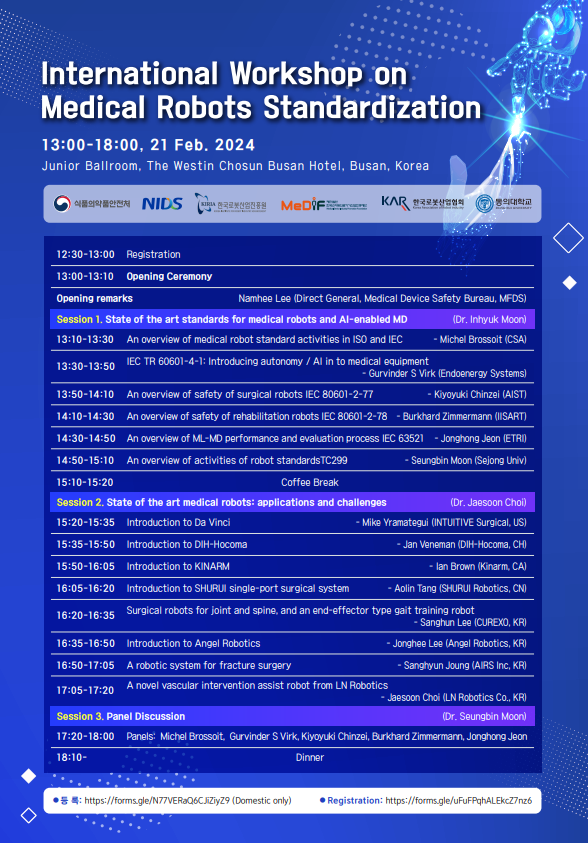 이번 의료로봇 국제표준화 회의는, 식품의약품안전처(MFDS), 의료기기안전정보원(NIDS), 한국로봇산업진흥원(KIRIA), 한국스마트의료기기산업진흥재단(MEDIF), 한국로봇산업협회(KAR), 동의대학교 스마트재활복지기술연구소가 공동으로 주관하고 있다.