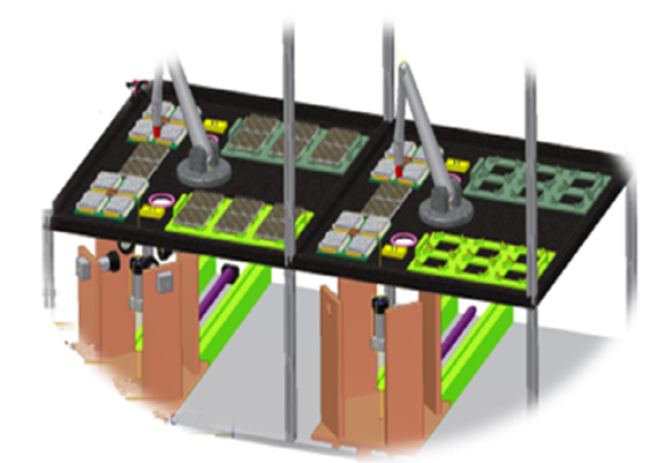 도금품 로딩/언로딩 공정은 제품의 투입 과정에서 비전시스템을 통해 정렬 사항을 확인하고 다관절 로봇을 투입하여 로딩과 언로딩을 실행하고 생산성 향상 및 생산비 절감 등을 실현하는 공정이다