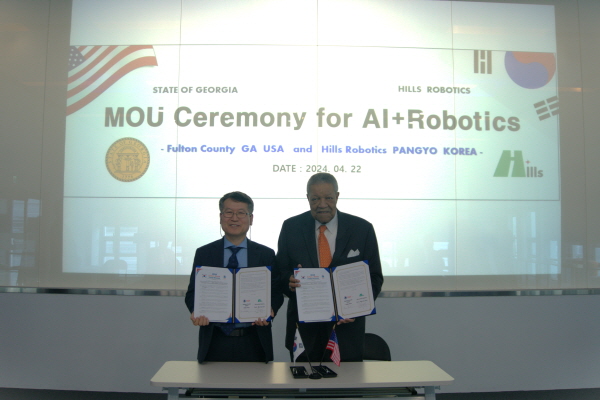 힐스로보틱스는 지난 22일 판교 본사에서 조지아주 풀턴카운티(Fulton County)와 지능형 로봇생산 인프라 구축 및 로봇 수출 촉진을 위한 사업협력 MOU(양해각서)를 체결했다고 23일 밝혔다.
