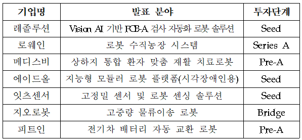한국로봇산업진흥원 강철호 원장은 “이번 사업을 통해 선정된 기업들은 기술력과 시장 확장 가능성을 두루 갖춘 유망 로봇 스타트업”이라며, “진흥원은 이들 기업이 시장을 선도하는 유니콘 기업으로 성장할 수 있도록 아낌없는 전주기적 지원을 이어가겠다.”고 밝혔다.