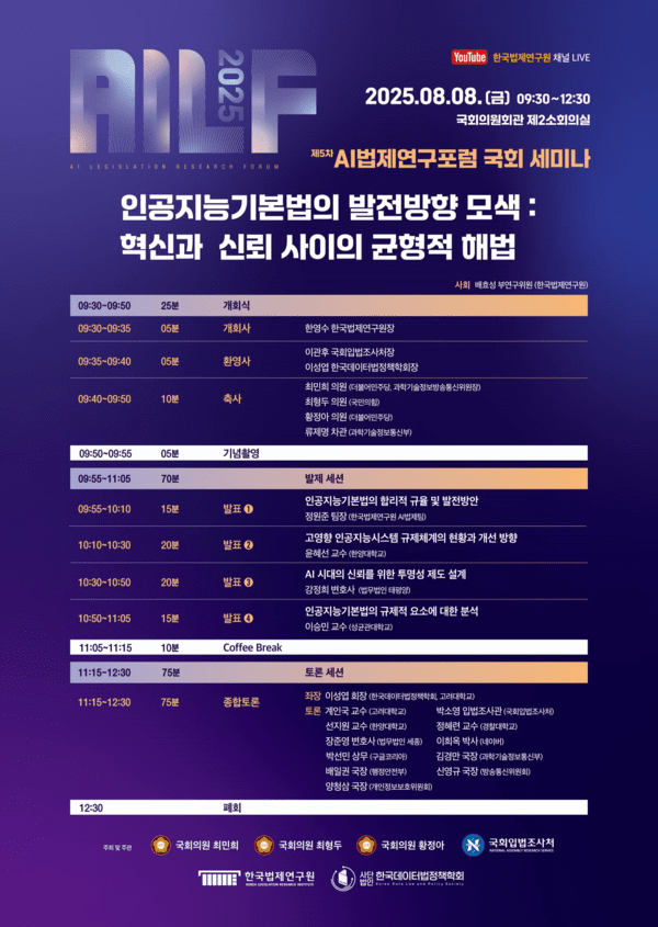 발제 이후에는 종합토론이 진행된다. 이성엽 한국데이터법정책학회 회장(고려대 교수)이 좌장을 맡고, 행정안전부, 과학기술정보통신부, 국회입법조사처, 네이버, 법무법인 세종 등 각 분야의 전문가들이 참여하여 법제, 기술, 산업, 정책 등 서로 다른 관점에서 인공지능기본법의 현실적 과제와 대응 방향을 심층적으로 모색할 예정이다. 이와 같은 다원적 논의는 인공지능 법제의 사회적 수용성과 실행 가능성을 높이는 데 기여할 것으로 기대된다.