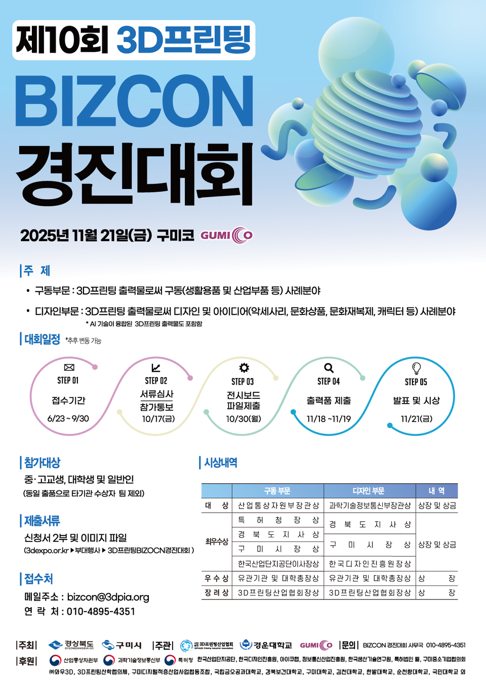 함께 진행되는 ‘제10회 슬롯사이트 벳위즈프린팅 BIZCON 경진대회’는 구동 부문과 디자인 부문으로 나눠 전국의 중·고교생, 대학생, 일반인이 참여한다. 예선을 거친 본선 진출작들은 행사 기간 동안 전시되며, 최종 발표 및 시상식은 11월 21일 진행된다. 구동 부문 대상에는 산업통상자원부 장관상, 디자인 부문 대상에는 과학기술정보통신부 장관상이 수여되며, 이외에도 최우수상·우수상·장려상이 주어진다.