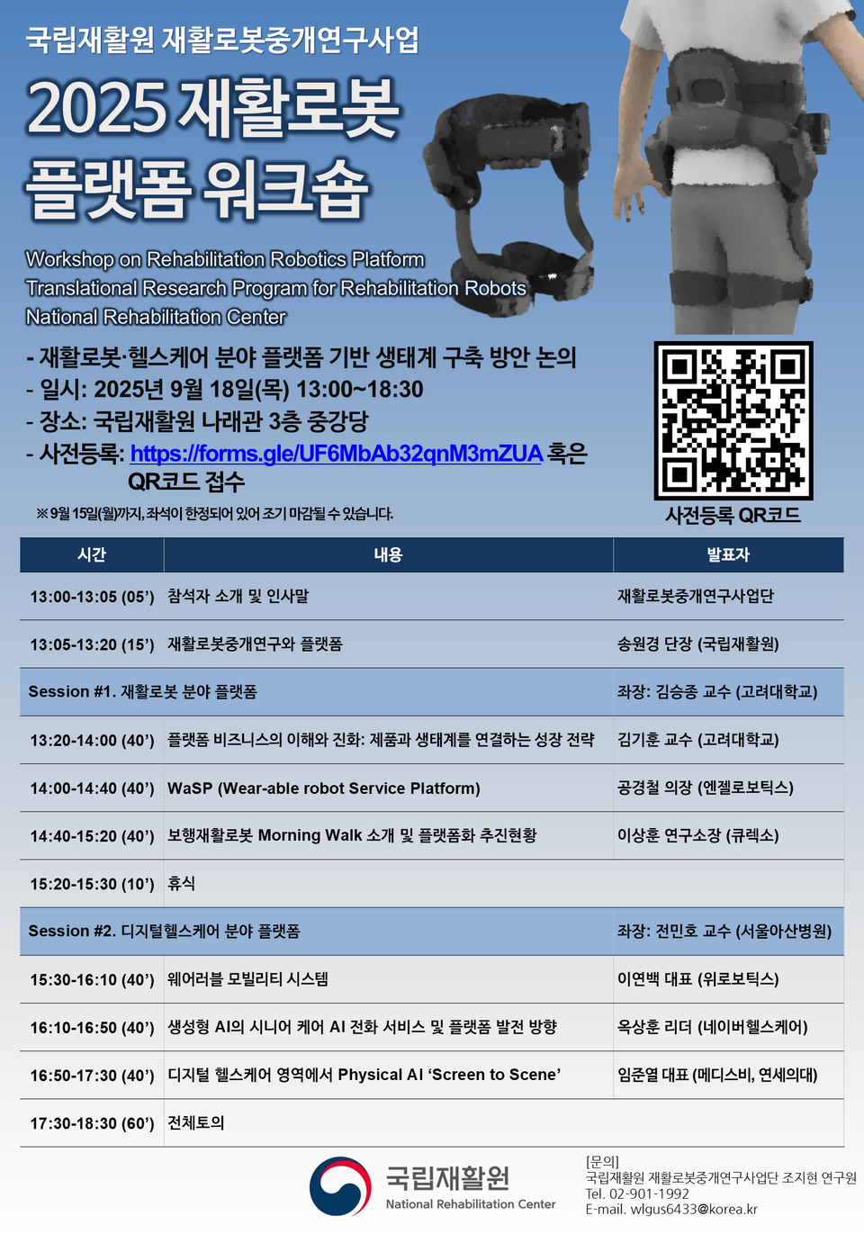 국립재활원 재활로봇중개연구사업단은 오는 9월 18일 ‘2025 재활로봇 플랫폼 워크숍’을 개최한다.