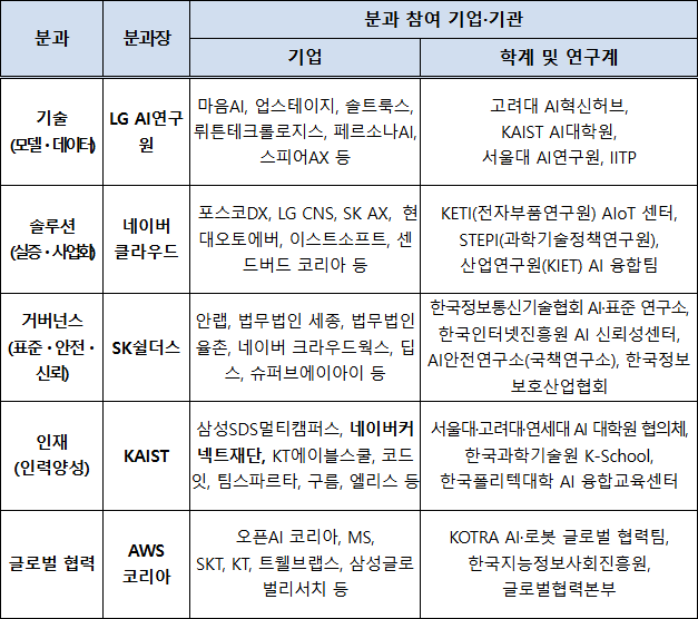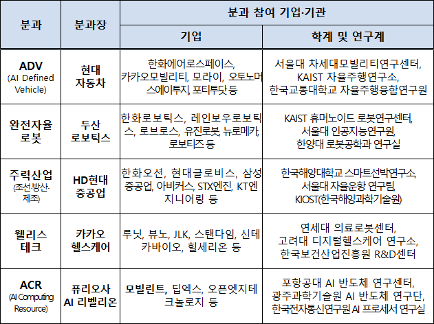 5개 생태계 분과는 임우형 LG AI연구원장(기술분과장), 김유원 네이버클라우드 대표(솔루션분과장), 민기식 SK쉴더스 대표(거버넌스분과장), 이광형 KAIST 총장(인재분과장), 윤정원 AWS 코리아 대표(글로벌협력분과장)를 필두로 피지컬AI 글로벌 기술패권 경쟁에서 우위를 선점하기 위한 민‧관 협력 모델, 국제 표준화 대응 전략 및 정책 방향 등을 도출하고, 5개 도메인 분과는 이동석 현대자동차 대표(ADV분과장), 김민표 두산로보틱스 대표(완전자율로봇분과장), 이상균 HD현대중공업 대표(주력산업분과장), 황희 카카오헬스케어 대표(웰리스테크분과장), 백준호 퓨리오사AI 대표‧박성현 리벨리온 대표(ACR공동분과장)를 중심으로 우리나라 산업 특성에 맞는 피지컬AI 기술개발 현장 활용 촉진 방안 및 현장 애로사항 등을 논의할 예정이다.