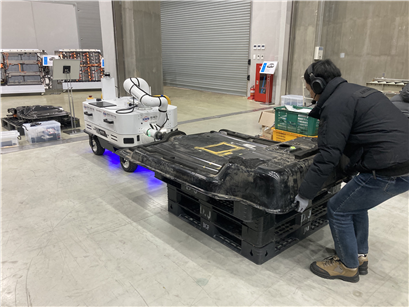 산업통상부의 로봇산업기술개발사업으로 ‘다품종 EV 폐배터리팩의 재활용을 위한 인간-로봇 협업 해체 작업 기술 개발’ 과제를 진행하고 있습니다. 로봇-로봇 간의 협력을 위해 모바일 매니퓰레이터의 전신제어 기술을 포함하는 프레임워크를 구현하였고, 로봇이나 사람이 혼자서는 해내기 어려운 폐배터리팩 커버 등 고하중 물체를 옮기는 협업 시스템을 개발하고 있습니다.
