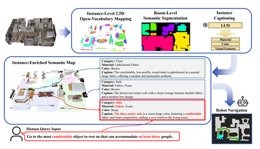 또한 경희대학교 RCI 랩과 공동으로, 로봇이 사람의 자연어 지시를 이해하고 실제 공간 속에서 스스로 이동할 수 있도록 하는 시각-언어 내비게이션(Visual-Language Navigation) 연구를 진행하고 있습니다. 이 연구에서는 인스턴스-엔리치드 시맨틱 맵(Instance-Enriched Semantic Map:객체 정보를 결합한 고해상도 시맨틱 맵)이라는 새로운 접근을 통해 로봇이 주변의 사물과 공간 구조를 더욱 세밀하게 인식하고 그 정보를 언어적 표현과 연결할 수 있도록 했습니다. 이를 통해 로봇은 “파란 소파 옆 테이블로 가”와 같은 복잡한 언어 지시도 상황에 맞게 이해하고 이동할 수 있는 능력을 갖출 수 있게 됩니다.