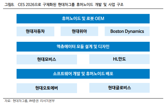 iM증권 이상수·배세호 연구원은 13일 발간한 보고서(제목:'보스턴다이나믹스는 현대차그룹 주가에 얼마나 영향을 주었나')에서 “관세 불확실성 해소가 주가 상승의 트리거가 되었으나, 기폭제는 CES 2026에서 공개한 보스턴다이나믹스의 아틀라스 및 그룹사와의 시너지였다”고 분석했다.