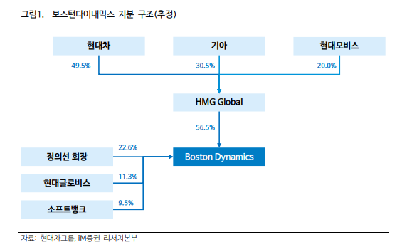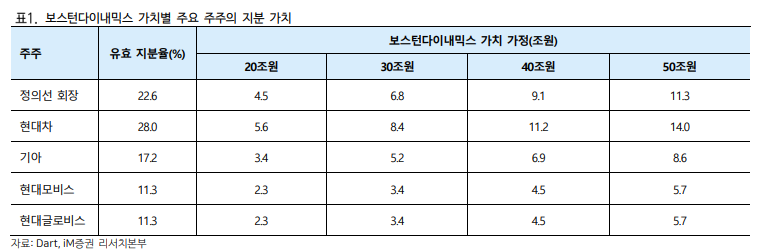 보고서는 IPO 등 신규 외부 투자를 통한 보스턴다이나믹스의 기업가치를 20조원으로 가정하면, 현대차 지분가치 5.6조원, 기아 3.4조원, 현대모비스 2.3조원, 현대글로비스 2.3조원이 된다고 분석했다. 30조원 가정 시에는 각각 8.4조원, 5.2조원, 3.4조원, 3.4조원으로 나타났다.