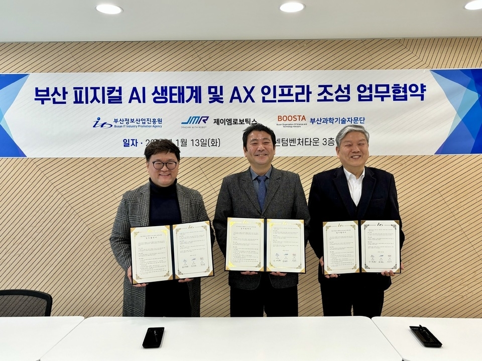 부산정보산업진흥원은 제이엠로보틱스, 부산과학기술자문단과 ‘부산 피지컬 AI 생태계 및 AX 인프라 조성’을 위한 업무협약(MOU)을 체결했다고 14일 밝혔다.